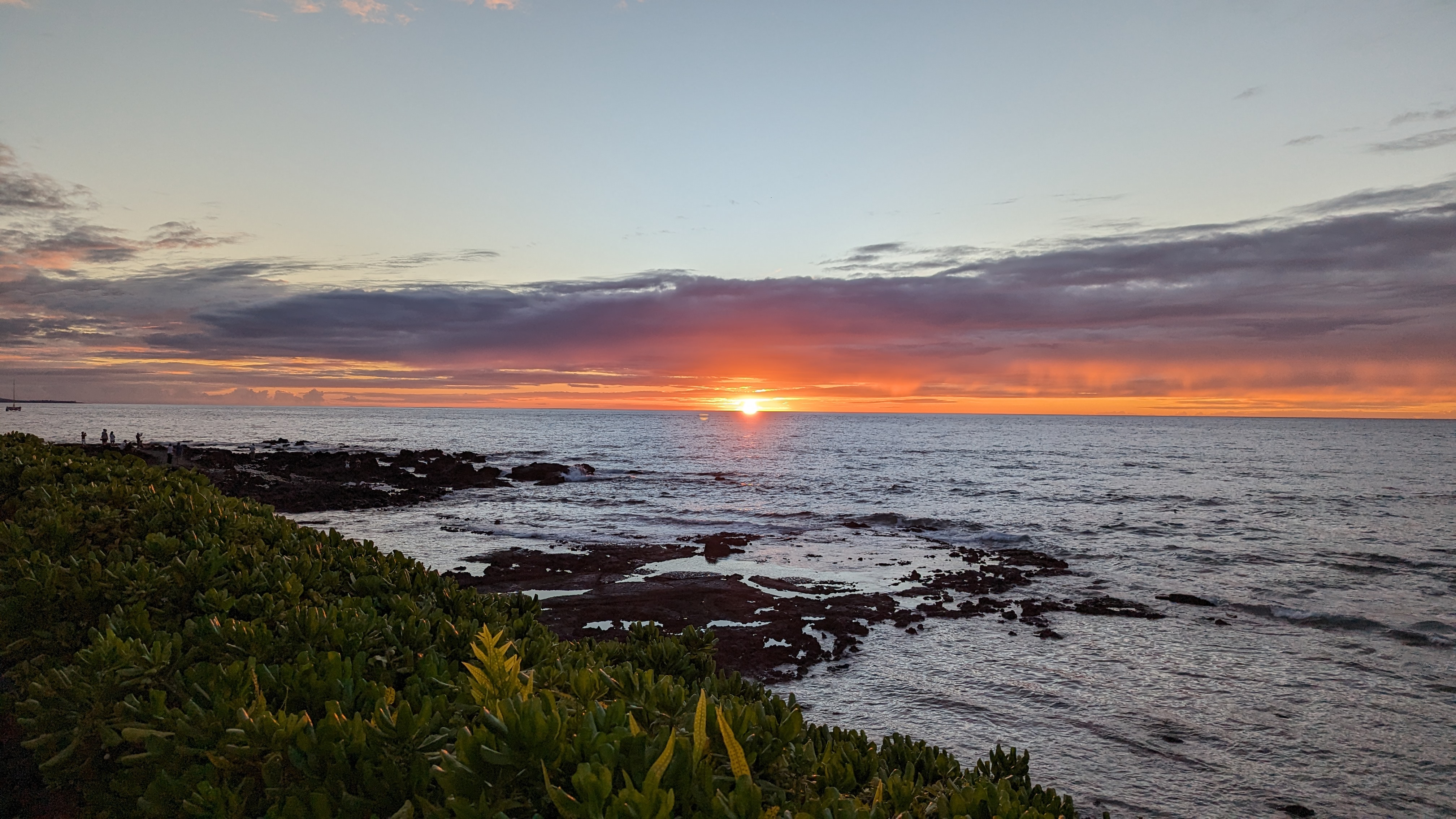 The end of this day was a wonderful lunch and Mai Tai at A-Bay’s in Waikoloa Village which just happened to be on the route but was much needed for the very tired two who just joined us and those that were just relieved they were here. After lunch, we checked into the hotel, became very skeptical about how much we were going to like it here, were blown away at our “basement room”, took in a beautiful sunset, drinks, and bites with an old friend of my husband. To the hotel for the moment, while our room ended up being breathtaking, it is a pretty big resort that was either a 10-minute walk to your room or a 10-minute wait for a monorail to get anywhere. Parking was terribly expensive. And you were forever away from anything other than what was available at the resort. This isn’t typically how we like to stay and we were grateful for a car but then ended up spending so much time driving everywhere we wanted to go and the Big Island is in fact very big so that was often hours at a time in the car. I do not recommend this unless you are a resort person. If you are, then this resort was beautiful. Our “basement room” opened directly onto a lawn which was overlooking the ocean. The accommodations were very up-to-date and very comfortable.