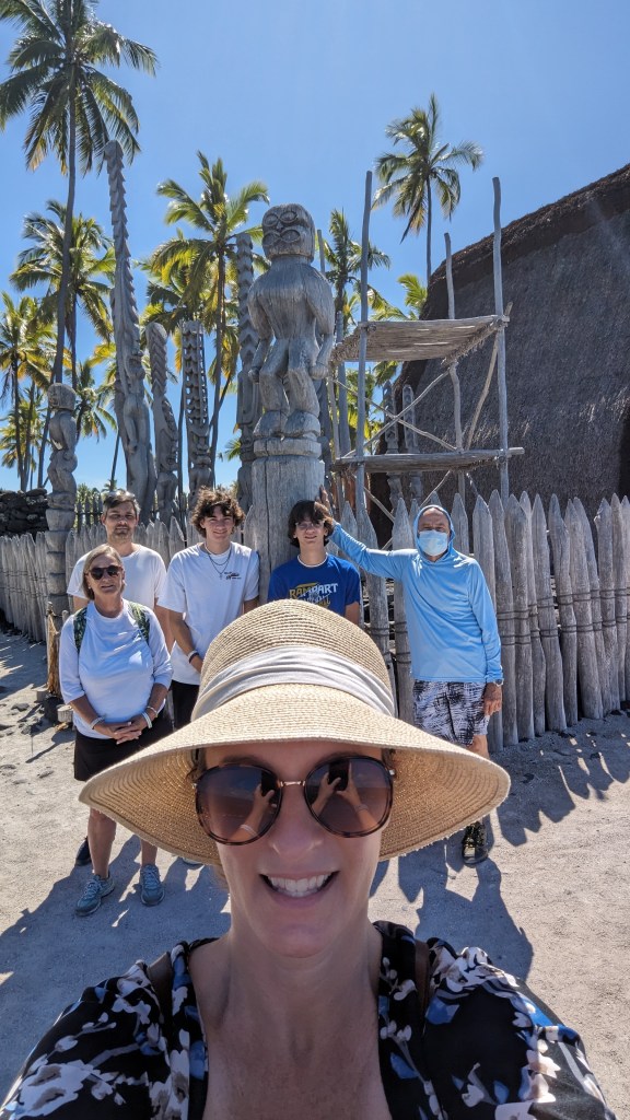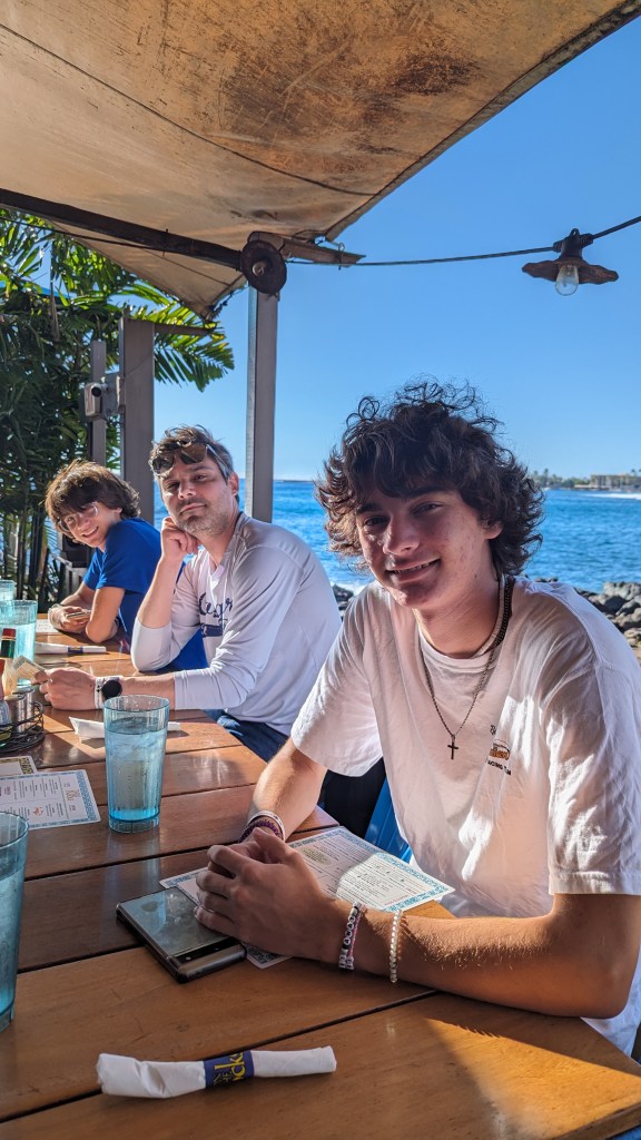 We get home, Papa tests, it looks negative and we finally take a deep breath and go to sleep. Going into our last day, we decided to try to hit the Black Sand Beach down south and Puʻuhonua o Hōnaunau and Two Step Beach which is called Two Step because it is two steps into the water and onto the reef. But the morning wasn’t going to cooperate. I didn’t trust the test the night before but decided I was overreacting. In the morning, Papa decided to test again and he was positive. Everyone slapped on their masks and started sanitizing everything. Whatever tiny scrap of a plan we had before gone. But Papa loves the ocean and feeling a little better than yesterday, he wanted to go snorkeling while we tried to find a way to get covid meds called in for him. Thank you, UnitedHealthcare’s virtual care, for getting the meds ordered and we did a little snorkeling at Two Step while we waited for it to be filled. This was a really good call. It was choppy but the sea life was wonderful. At one point, we were worried that Papa had swum out to the ocean to call it a life because he was enjoying himself for so long we couldn’t even see him anymore. In the midst of all this, we are also trying to coordinate new flights, find places for them to stay since their return would now be delayed. Everyone took a big sigh and tried to make it through. We grabbed food at an outdoor restaurant which isn’t really worth mentioning – Papa masked of course. My youngest decided that he really doesn’t like the ocean. Everyone is just over everything at this point.
